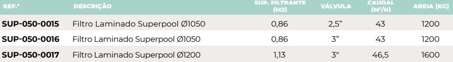 | Modelos Filtros | Filtro Laminado Superpool Ø1050, Filtro Laminado Superpool Ø1050 3, Filtro Laminado Superpool Ø1200 |