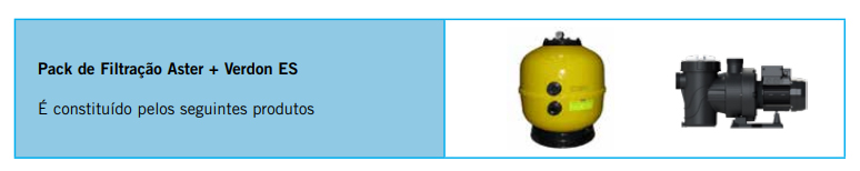 | Pack Filtração | Aster Ø 500 + Verdon ES 3/4 CV Mono, Aster Ø 600 + Verdon ES 1 CV Mono, Aster Ø 600 + Verdon ES 1 CV Tri |