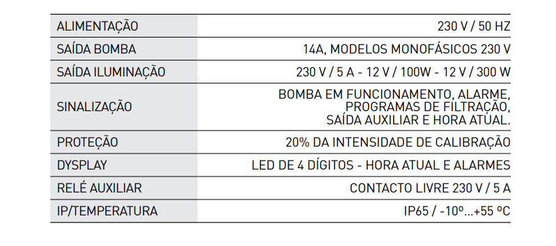 • 2 programadores horários para a filtração e um programador para a iluminação;